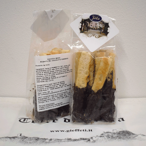 Listelle di focaccia secca bagnata nel cioccolato fondente